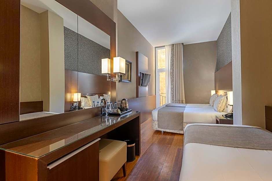 This bright, twin/double room features air conditioning and wooden floors. Rooms are soundproofed and include a mini-bar and flat-screen TV. A safe is available to hire, and the private bathroom includes hairdryer and amenities.